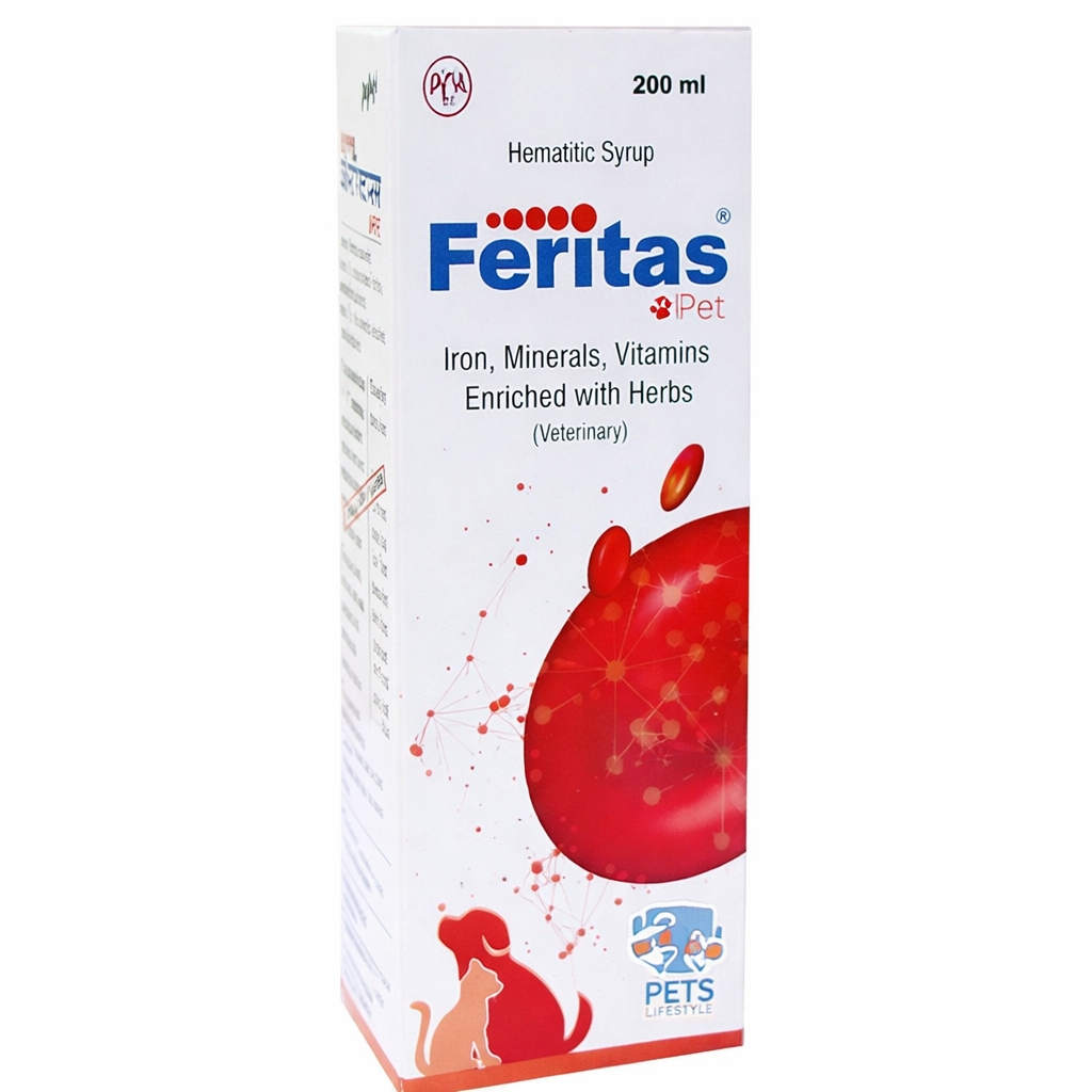 Feritas Hematinic Syrup 200 ml for Cats is a veterinary nutritional supplement formulated to support red blood cell formation, immune function, and overall vitality in felines. Enriched with iron, essential amino acids such as L-lysine and taurine, trace minerals, and antioxidant vitamins, it is commonly recommended during recovery from illness, anemia, stress, or nutritional deficiencies. Suitable for kittens, adult cats, and senior felines under veterinary guidance, Feritas helps restore metabolic balance and improve energy levels when dietary intake alone may not be sufficient.